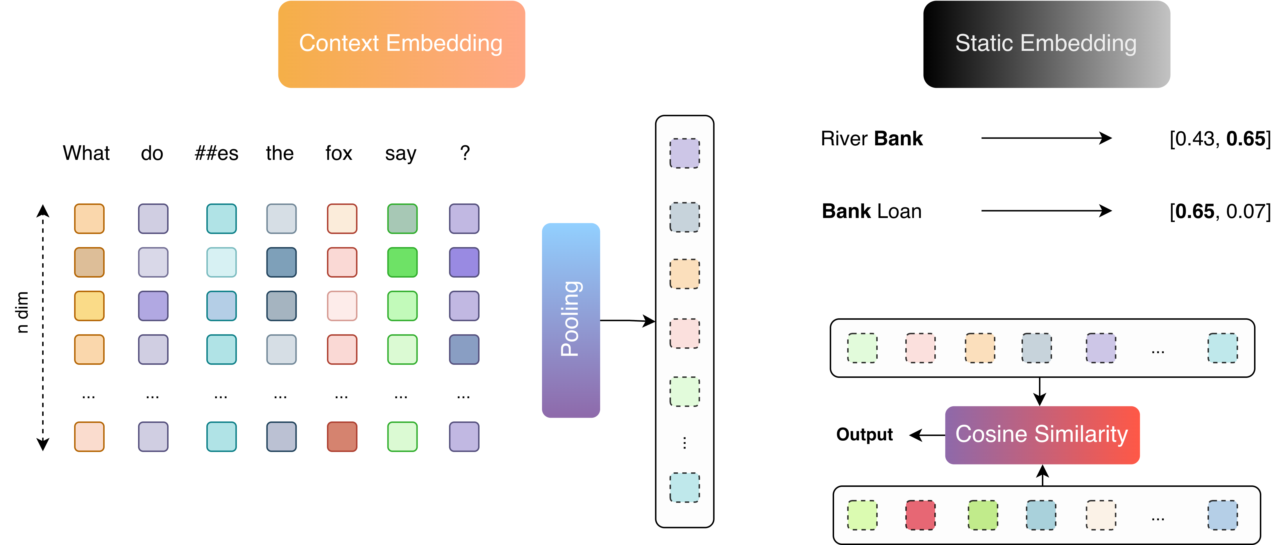 Not all embedding models work the same way. We can categorize them along a few dimensions: how they treat context (static vs. contextual embeddings), what textual unit they embed (word-level vs. sentence-level), how are they trained ( unsupervised or supervised), the nature of the vector representations (dense vs. sparse embeddings), the interaction during scoring (single vector comparison vs. token-level max similarity, also called late interaction) and their type of purpose (symmetric vs. asymmetric). Understanding this taxonomy will clarify the landscape of embedding techniques and when to use each.